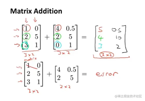 矩阵的加法:行列相同的两个矩阵把Aij和Bij相加。比如下图中结果C11(C是结果) = A11 + B11, 5 = 1 + 4。剩下的结果也直接对应的相加就可以得出结果。但是只能是行列相同的矩阵进行加法,不同的行列没法进行加法。