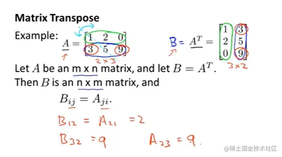 矩阵的转置:将A的所有元素绕着一条从第1行第1列元素出发的右下方45度的射线作镜面反转,即得到A的转置。简单来说就是矩阵的行列互换就是矩阵的转置,A是一个mxn的矩阵,行列互换为AT是一个nxm的矩阵,A和AT互为转置。