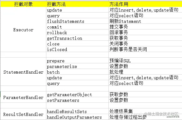 而MyBatis的插件正是基于拦截这四大对象来实现的。需要注意的是,虽然我们可以拦截这四大对象,但是并不是这四大对象中的所有方法都能被拦截,下面就是官网提供的可拦截的对象和方法汇总: