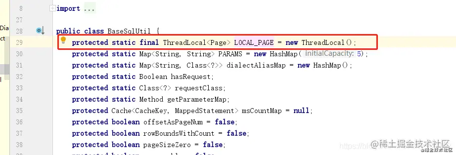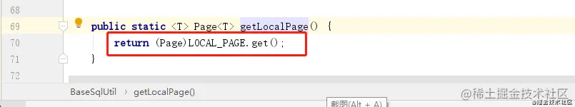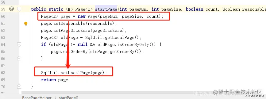 这是一个本地线程池变量,那么这里面的Page又是什么时候存进去的呢?这就要回到我们的示例上了,分页的开始必须要调用: