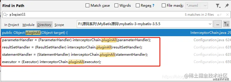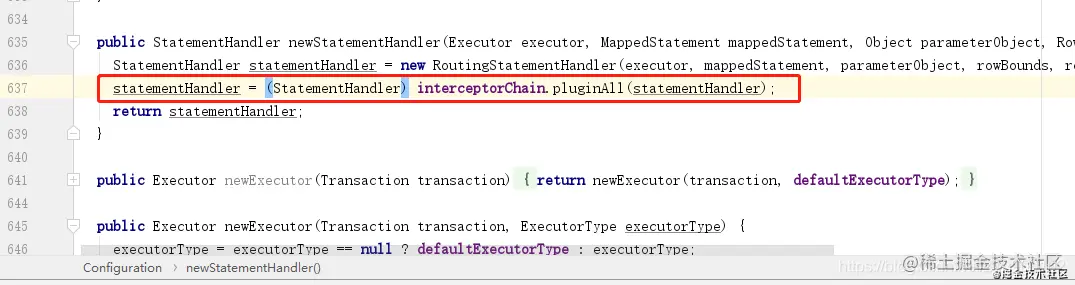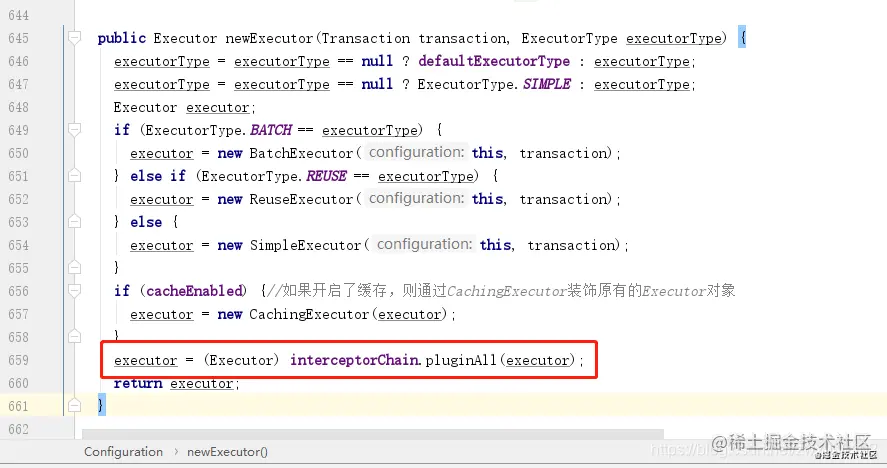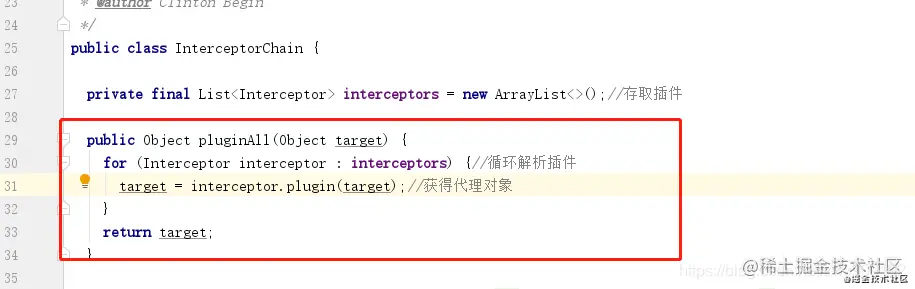 可以看到,当初始化完成Executor之后,会调用interceptorChain的pluginAll方法,pluginAll方法本身非常简单,就是把我们存到list中的插件进行循环,并调用Interceptor对象的plugin方法: