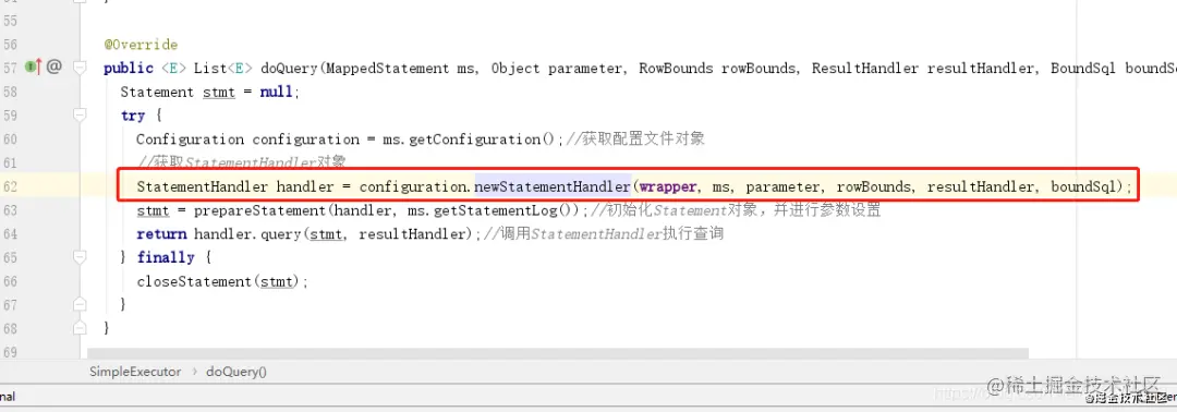 接下来我们再看看StatementHandler,StatementHandler是在Executor中的doQuery方法创建的,其实这个原理就是一样的了,找到初始化StatementHandler对象的方法: