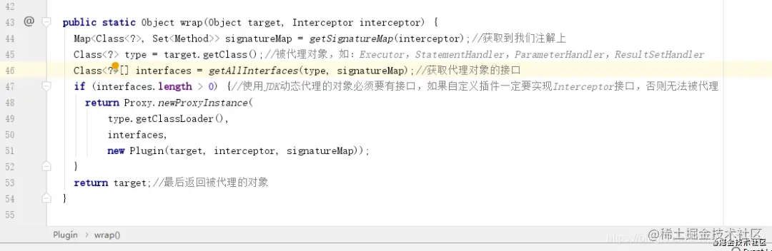 可以看到这个方法的逻辑也很简单,但是需要注意的是MyBatis插件是通过JDK动态代理来实现的。