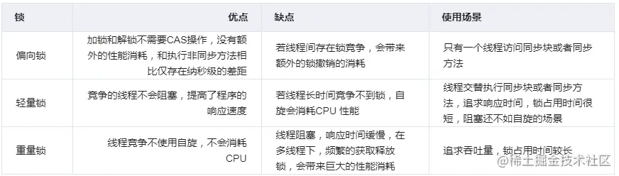 无锁争用的时候使用偏向锁,第二个线程到了升级为轻量级锁进行竞争,更多线程时,进入重量级锁阻塞