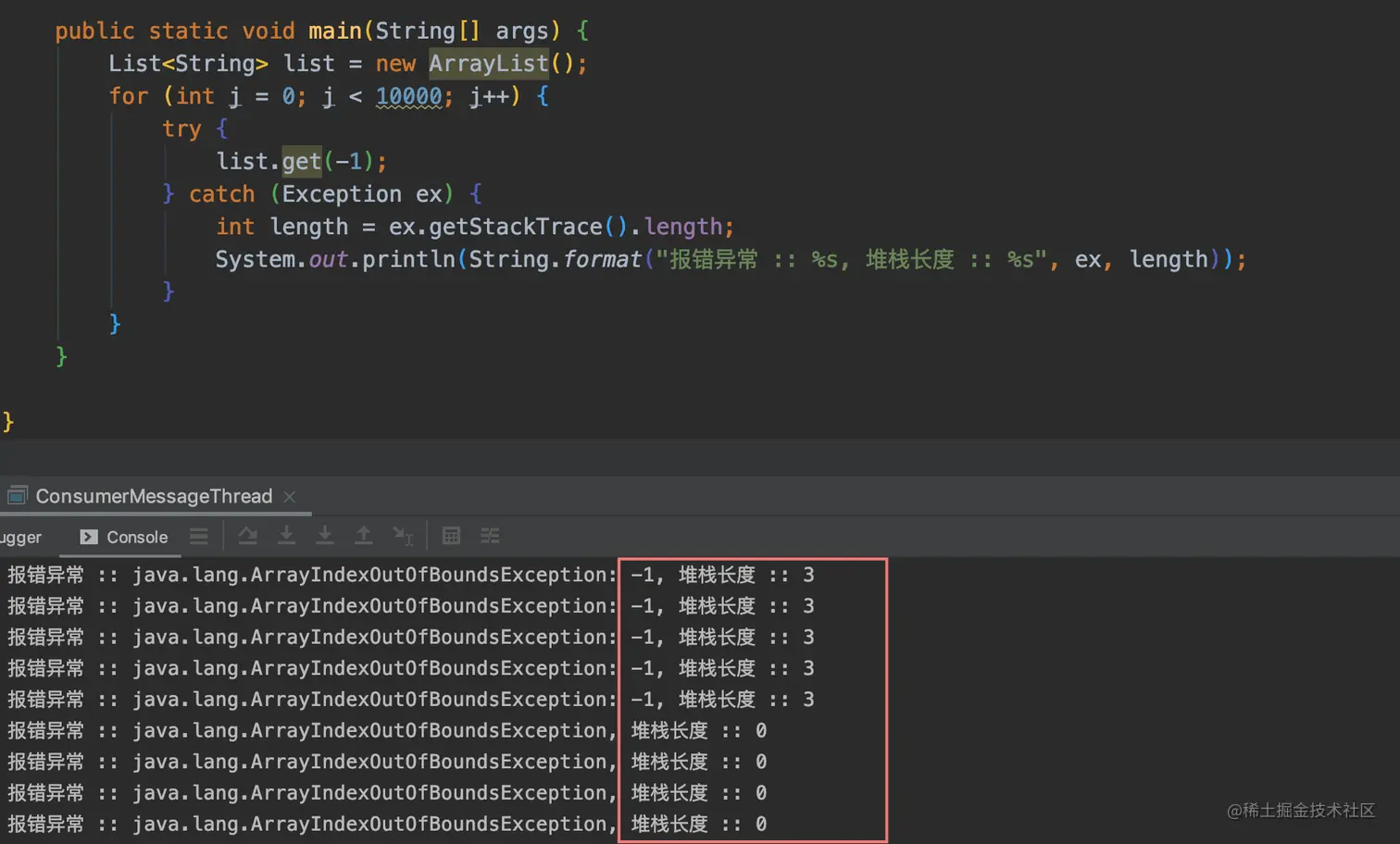 大白话一点来说,就是:当一些异常类型(空指针、下标越界、算术运算等...)在代码里的固定位置被抛出多次,虚拟机(HotSpot VM)会直接 抛出一个事先分配好、类型匹配的异常对象。此异常对象的 message 和 stack trace 都为空
