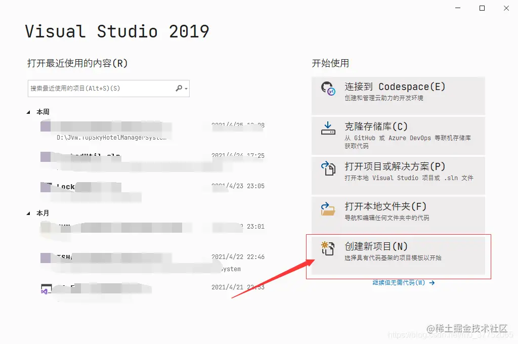 步骤一:这里以VS2019为例,打开VS2019,选择【创建新项目】选项;