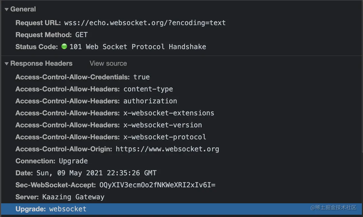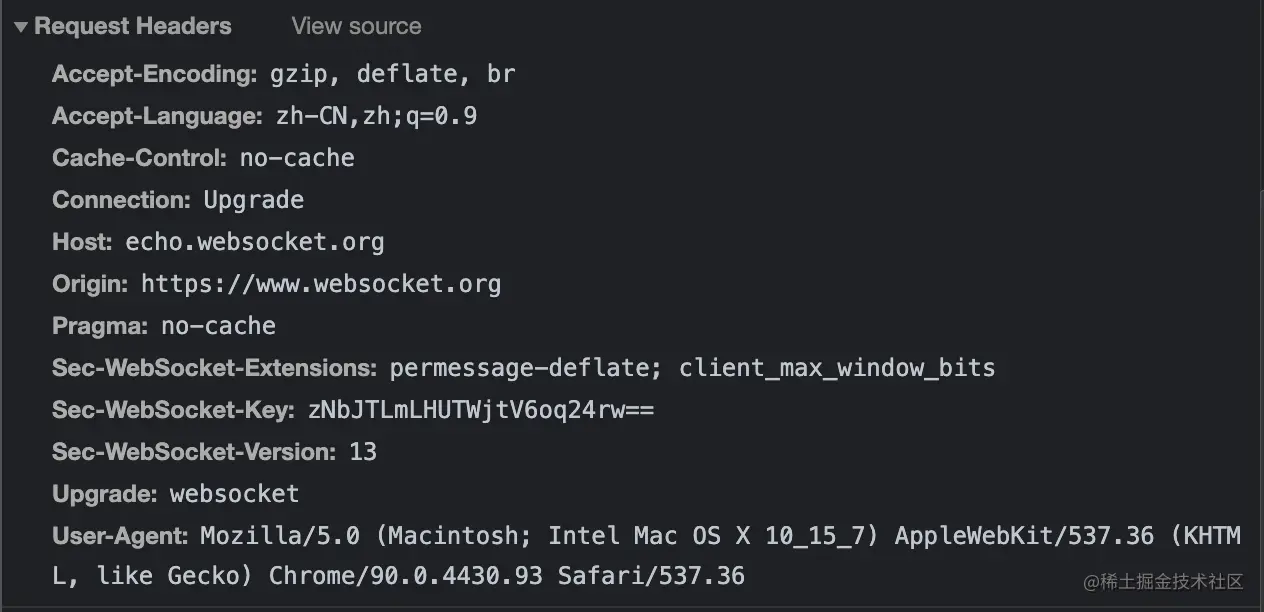 http 通过判断 header 中是否包含 Connection: Upgrade 与 Upgrade: websocket 来判断当前是否需要升级到 websocket 协议,除此之外,还有其它 header: