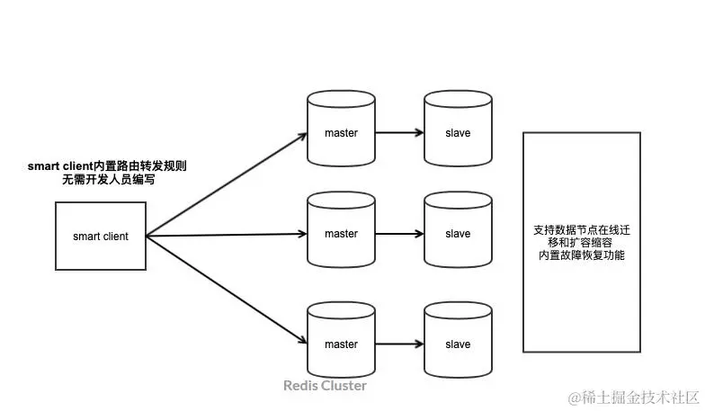 没有了Proxy层进行转发,客户端可以直接操作对应的Redis节点,这样就少了Proxy层转发的性能损耗。