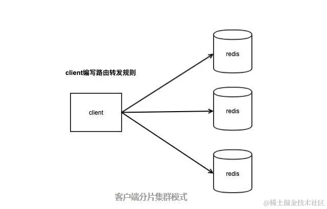 客户端通过固定的Hash算法,针对不同的key计算对应的Hash值,然后对不同的Redis节点进行读写。