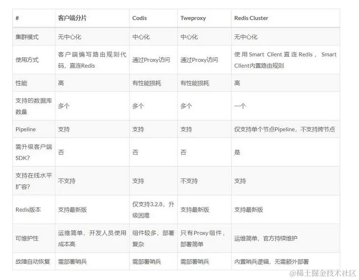 它们还可以用是否中心化来划分,其中客户端分片、Redis Cluster属于无中心化的集群方案,Codis、Tweproxy属于中心化的集群方案。