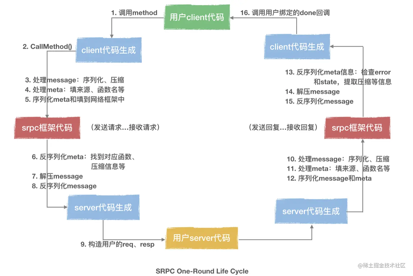 根据上图,可以更清楚地看到刚才提及的各个层级,其中压缩层、序列化层、协议层其实是互相解耦打通的,在SRPC代码上实现得非常统一,横向增加任何一种压缩算法或IDL或协议都不需要也不应该改动现有的代码,才是一个精美的架构~