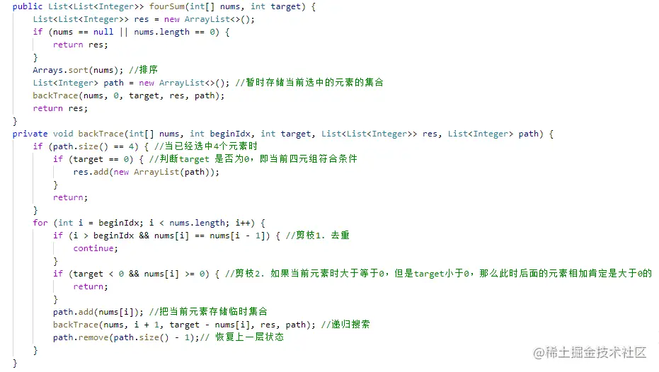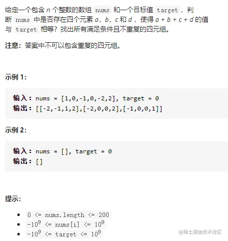 因为要求答案中不可以包含重复的四元组,那么常用的去重技巧就是把数组元素进行排序。