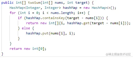 解法二:利用hashmap使时间复杂度降到O(n),核心思想就是用数组的元素作为Key,元素对应的下标作为value。遍历数组,对每一个元素,判断target-当前元素是否在Map中,如果存在说明数组中存在两数和为target的二元组,如果不存在,则把当前元素放入map中。