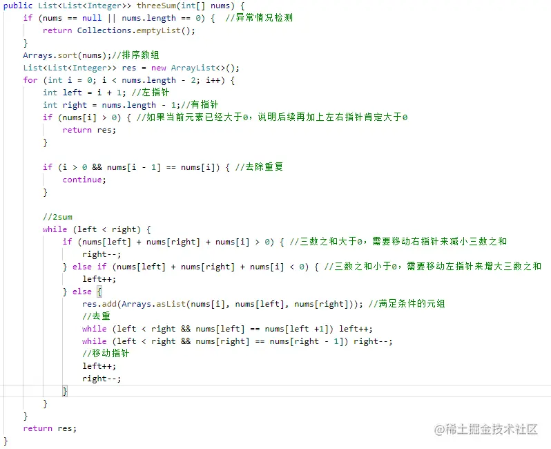 分析:针对于区别一没啥说的;区别二,0可以看成是特殊的target;区别三,需要去重一般的套路就是排序或者hash嘛。2sum我们都会做了,那怎么才能把3sum转换为2sum呢? 一个重要的思想就是:先固定一个数,假设为a,那么题目就变成了,从剩下的数组元素中找到两个元素,其和为target-a,即0-a,发现了吗,当你固定一个数的时候剩下的就变成了2sum问题。