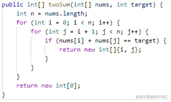 解法一:首先同上,可以用两个for循环暴力搜索所有组合。当找到符合条件的二元组时直接返回他们的下标。这种解法的时间复杂度是O(n^2^),空间复杂度是O(1)。