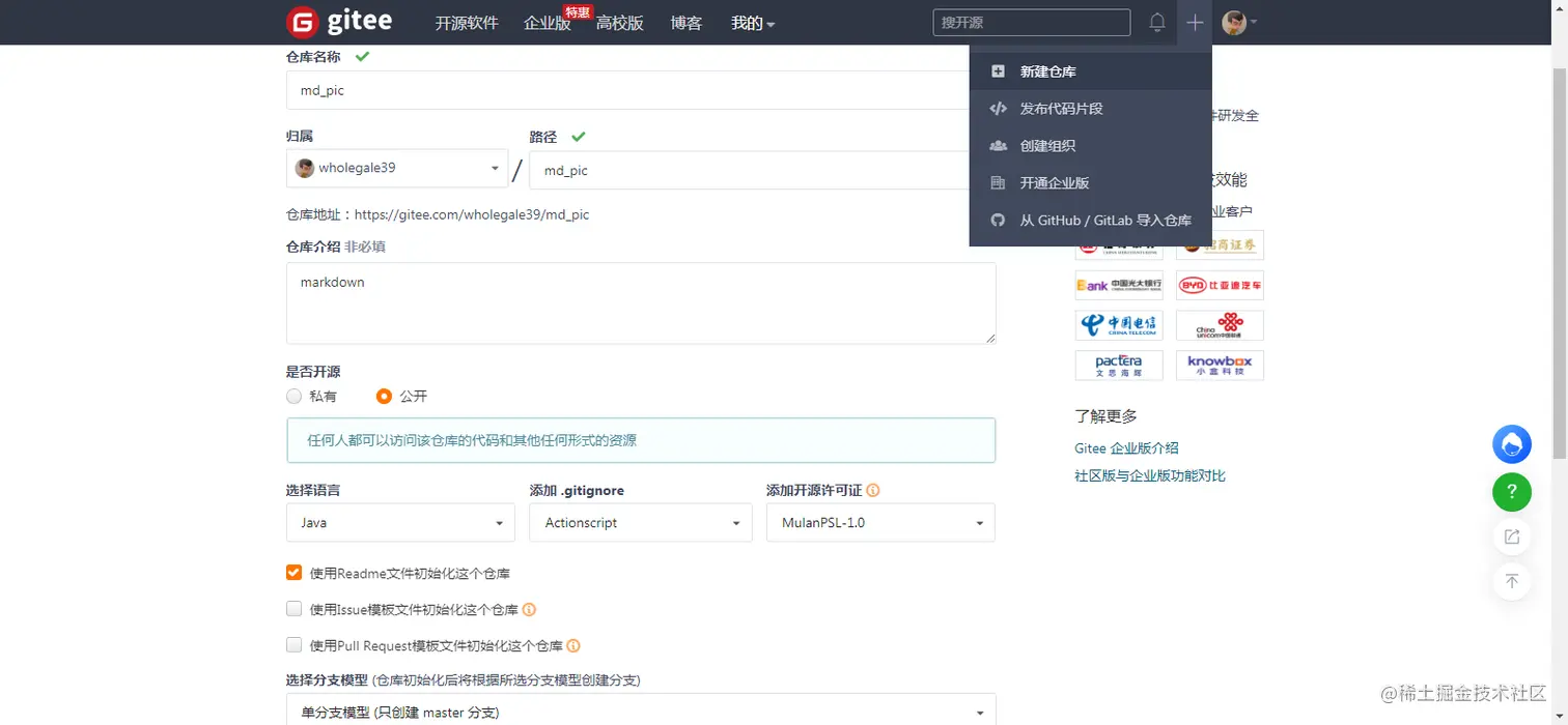1.注册完毕Gitee账号后,点击右上角+号,点击新建仓库,各选项如图所示