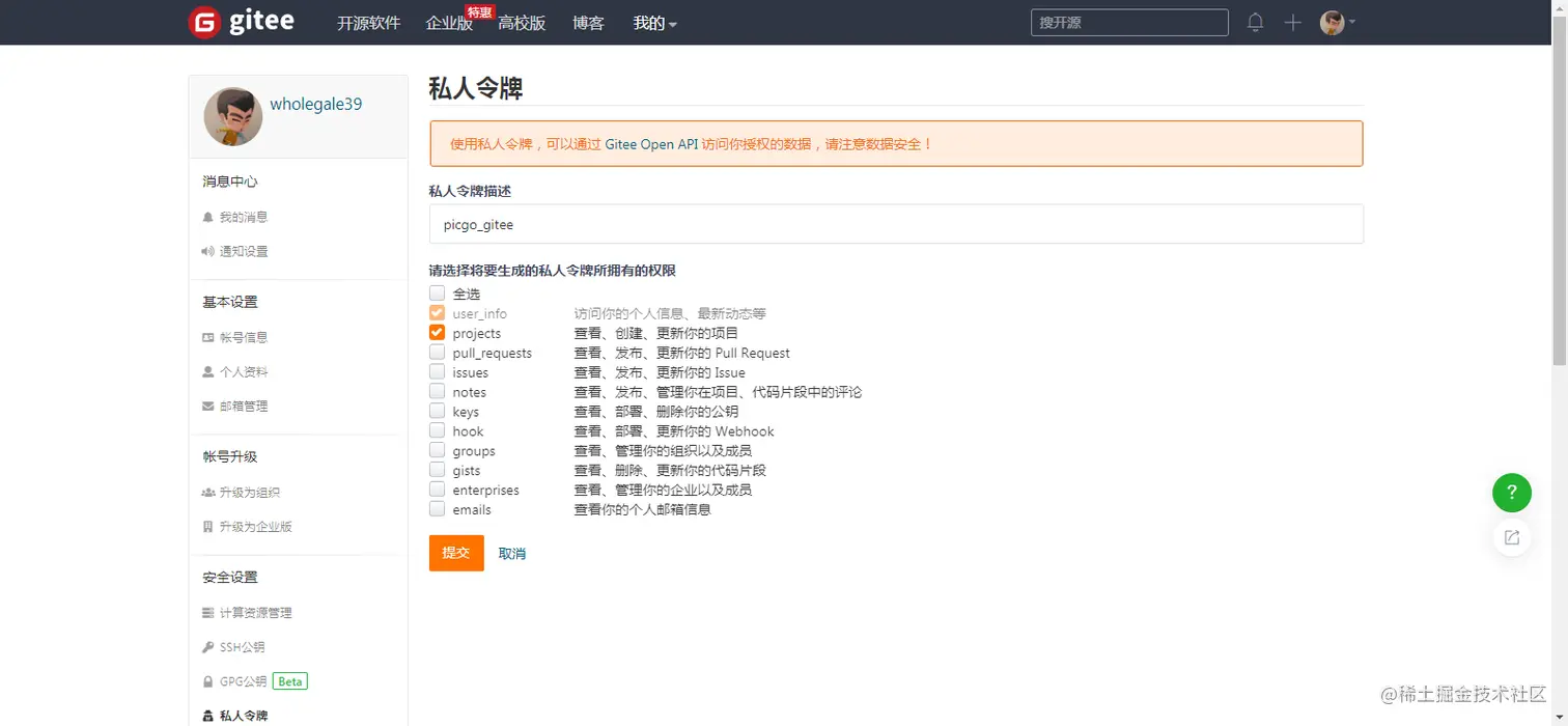 2.创建私人令牌,各选项如图所示,创建成功后一定先复制令牌备用