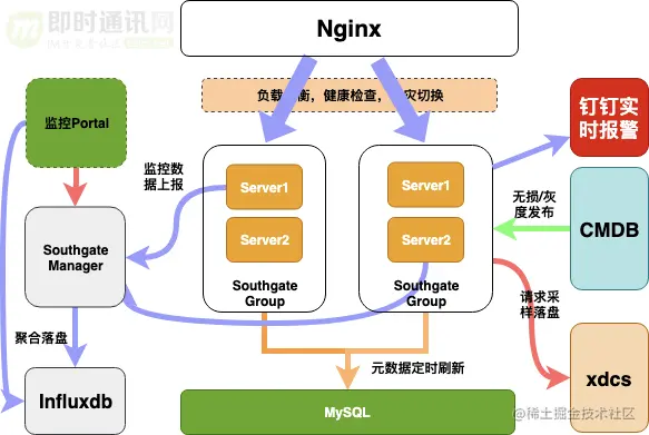 网关业务方能看到的是监控和报警,我们是实现秒级别报警和秒级别的监控,监控数据定时上报给我们的管理系统,由管理系统负责聚合统计,落盘到 influxdb。
