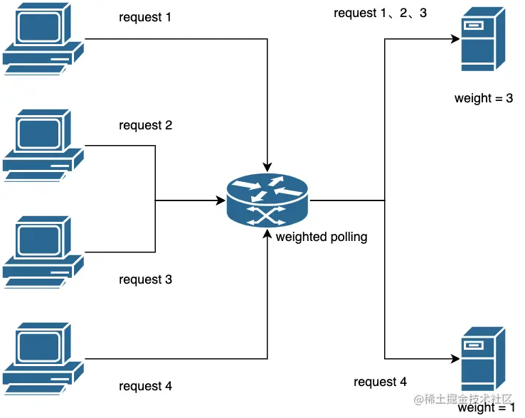 但是如果每个节点的处理能力不一样呢?虽然流量是均分的,但是由于中间有处理能力较弱的节点,这些节点仍然存在过载的可能性。于是我们就有了下面这种负载均衡算法。