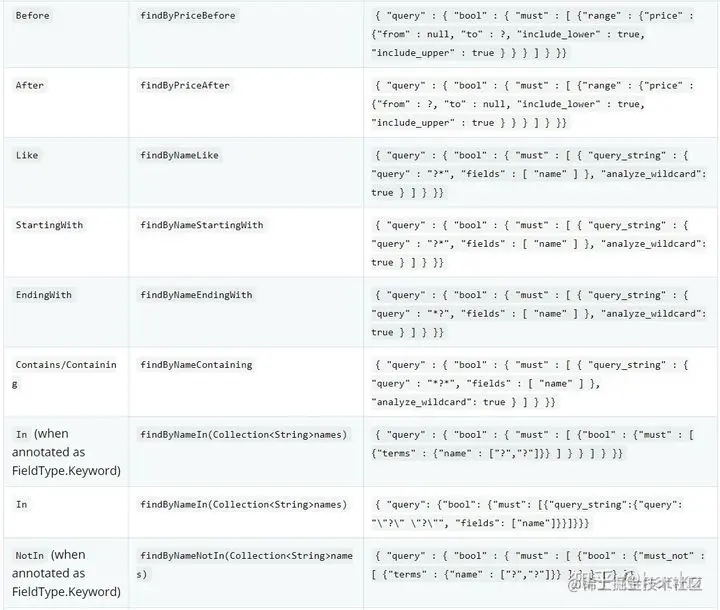 @BeforeEach void setUp() { } /** * 创建或更新index document * 删除类似,方法名为personRepository.delete */ @Test void create_update() { Person person = Person.builder() .id("101") .firstname("hanko java") .lastname("zhou") .build(); Person result = personRepository.save(person); assertNotNull(result); assertEquals(person.getId(),result.getId()); } /** * 通过Lastname精确查询 */ @Test void findByLastname() { List<Person> result = personRepository.findByLastname("zhou"); assertNotNull(result); result.forEach(res-> System.out.println("查询结果:"+res)); } /** * 通过Firstname模糊查询 * 以Like Contains Containing结尾即模糊查询 * Like 支持通配符 类似 han 会自动变为 han* * Like类似StartingWith */ @Test void findByFirstnameLike() { List<Person> result = personRepository.findByFirstnameLike("han"); assertNotNull(result); result.forEach(res-> System.out.println("查询结果:"+res)); } /** * 通过Firstname模糊查询 * 以Like Contains Containing结尾即模糊查询 * Contains 支持通配符 类似 han 会自动变为 *ank* * */ @Test void findByFirstnameContains() { List<Person> result = personRepository.findByFirstnameContains("ank"); assertNotNull(result); result.forEach(res-> System.out.println("查询结果:"+res)); }
