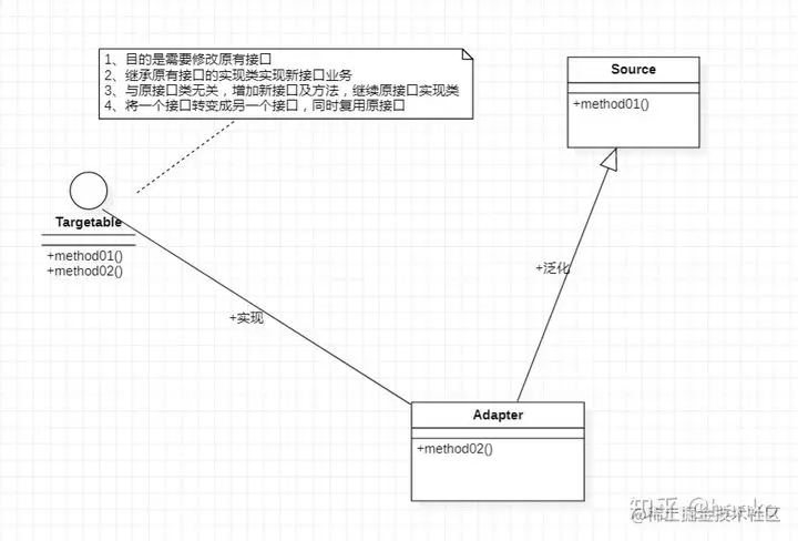 - 适配器模式适合需要增加一个新接口的需求,在原接口与实现类基础上需要增加新的接口及方法。类似原接口只能method01方法,需求是增加method02方法,同时不再使用之前接口类。