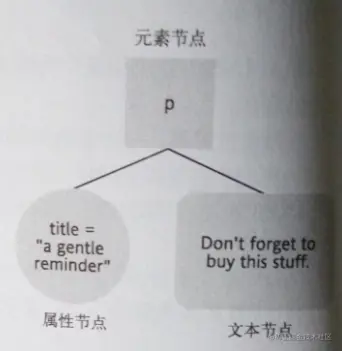 在DOM中title="a gentle reminder"是一个属性节点(attribute node),在前面的例子中无序清单元素<ul>有个id属性。有些清单元素<li>有class属性。