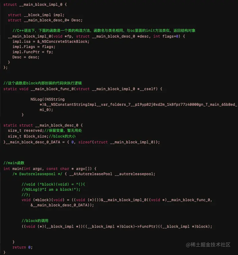 block->FuncPtr(block);为什么没报错?因为按照我们的代码结构,应该是block->impl->FuncPtr(block);才对。 且看struct __main_block_impl_0中的第一个成员为struct __block_impl impl;,说明impl是一个结构体,不是指针,所以可以直接把它的内容搬到struct __main_block_impl_0来理解因此