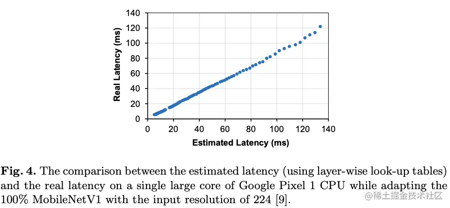 图4对比了对MobileNetV1进行优化过程中估算的时延与实际时延,可以看到两个值是高度相关的。