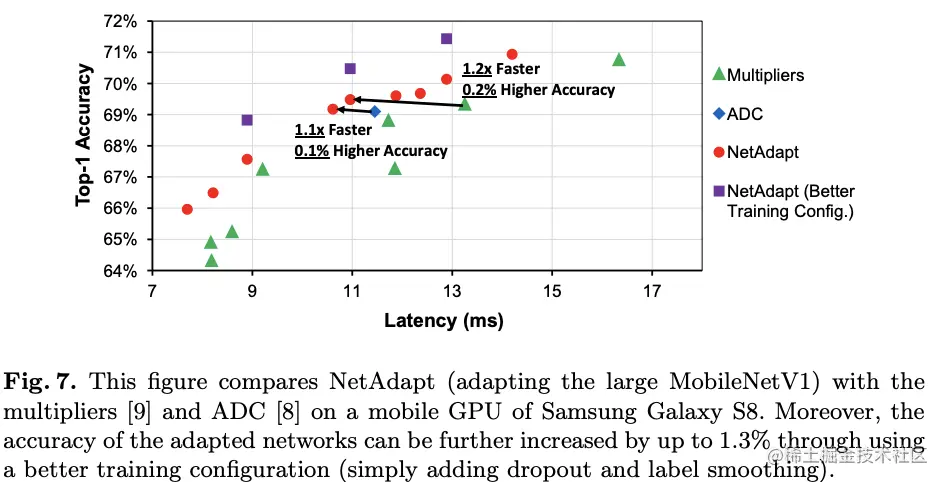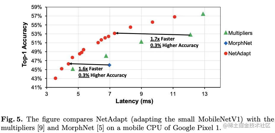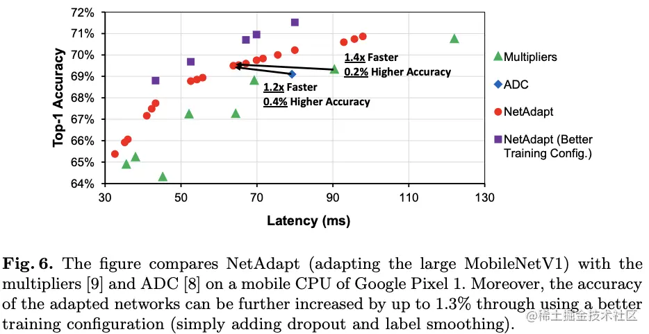 在NetAdapt的每次迭代中,都使用相对较小的次数(short-term)fine-tune搜索到的简化网络来恢复准确率,这一步对于小网络而言相当重要。由于大量减少资源量,如果不这样做,网络的准确率可能会降为零,导致算法选择了错误的网络。随着算法的进行,虽然网络会持续训练,但还没到收敛的地步,所以当得到最后的一系列自适应网络后,使用较多的次数(long-term)fine-tune直到收敛作为最后一步。