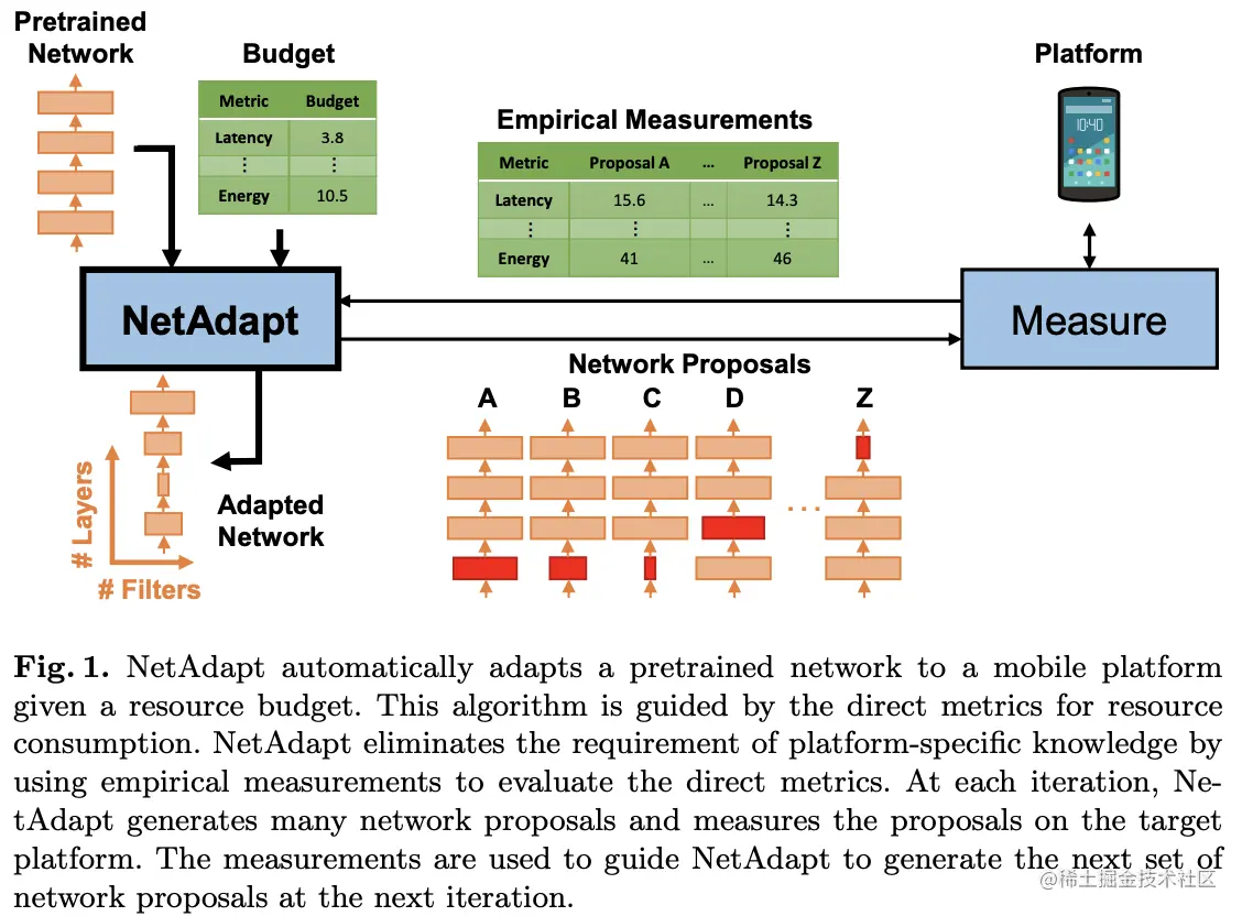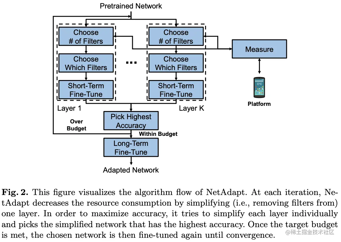 为此,论文提出平台相关的自动化网络简化方法NetAdapt,逻辑如图1所示,以迭代优化的方式慢慢获取满足预期资源消耗的网络。NetAdapt将资源直接指标引入优化过程,可同时支持多种资源约束,能够快速搜索平台相关的简化网络。