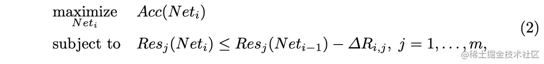 是第次迭代产生的准确率最高的网络,是初始预训练模型。随着迭代次数的增加,网络的资源消耗会变得更少,代表次迭代中资源的缩减量,整体的想法类似于学习率调度。当满足所有资源时,算法终止,输出每一轮迭代优化中最优的网络,从中选择合适的网络。