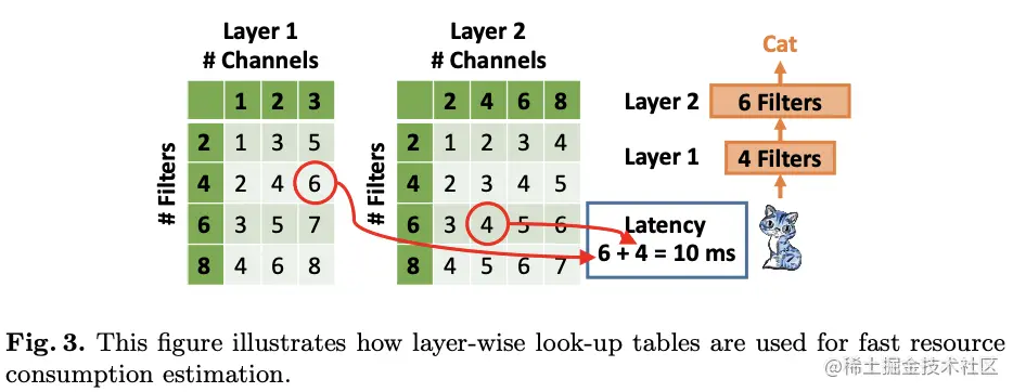 论文通过建立多个layer-wise look-up表格来解决上面提到的资源消耗计算问题,即前面提到的经验估计。每个表格预先计算对应层的在不同的输入维度和核数量下的资源消耗,注意相同输入大小和配置的层可以共用表格内容。在估算时,先找到对应的层的表格,通过累计layer-wise的资源消耗来估算network-wise资源消耗,逻辑如图3所示。