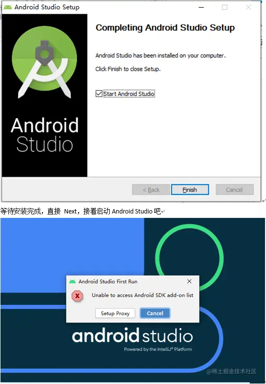 开始载入Android Studio主程序,出现了Unable to access Android SDK add-on list这里选择了Cancel,一直下一步安装SDK,时间相对较长