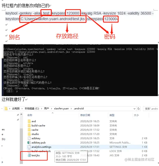 keytool -genkey -alias test -keypass 123000 -keyalg RSA -keysize 1024 -validity 36500 -keystore C:\Users\xiaofen.yuan\.android\test.jks -storepass 123000