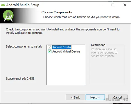 (Android Virtual Device安卓虚拟设备,就是在电脑上虚拟出安卓手机的环境,让你可以直接在电脑上运行开发出的APP,建议不要勾选,测试APP的话,直接在真机(一部安卓手机)上测试更好,因为官方出的这个安卓虚拟设备,在电脑上运行很慢,即便你没有一部安卓手机,也可以选择其他的安卓模拟器,运行速度都比这个快)