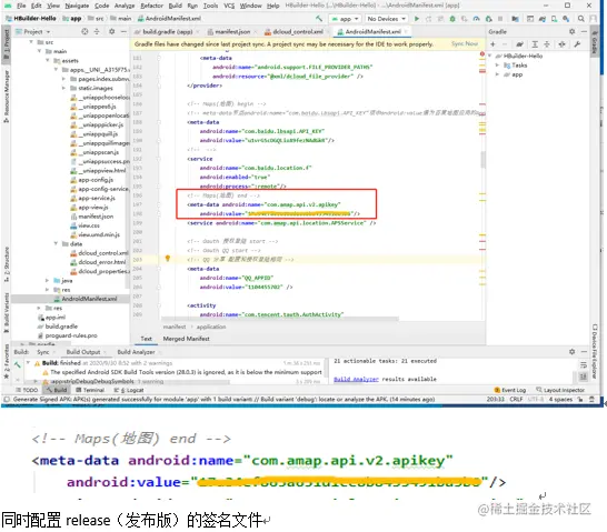 接着修改AndroidMainfest.xml里android:name="com.amap.api.v2.apikey"的value值