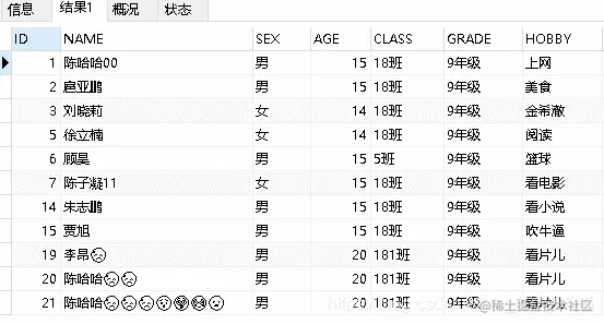 VALUES ('20', '陈哈哈😓', '男', '20', '181班', '9年级', '看片儿');