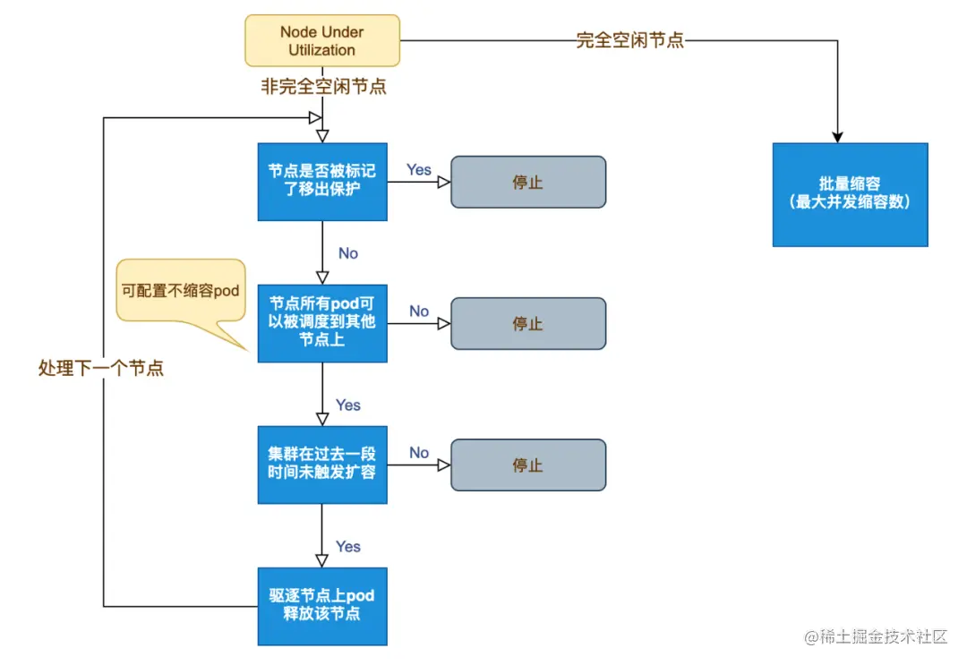举个 kubernetes Cluster AutoScaler 的例子: 在腾讯云容器服务里节点的缩容策略: