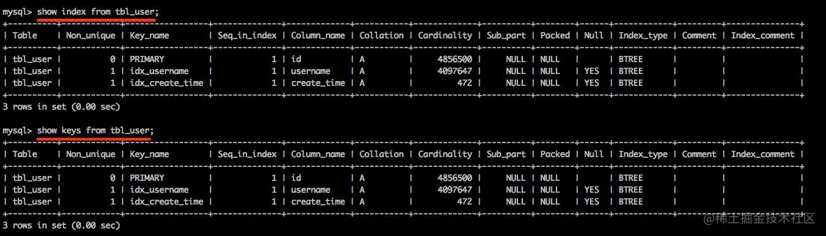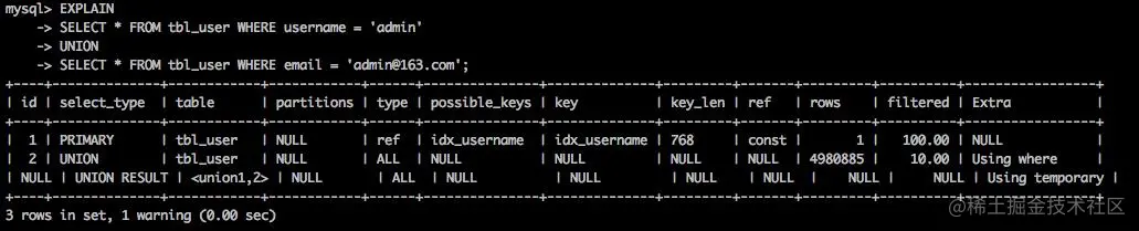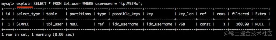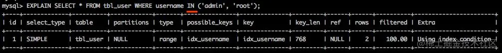 explain命令用于查看sql执行时是否使用了索引,是优化SQL语句的一个非常常用而且非常重要的一个命令, 上面中的key字段表示查询使用到的索引即使用了idx_username索引