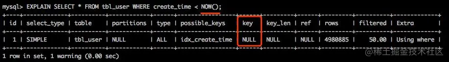 使用函数计算不走索引,无论是对字段使用了函数还是值使用了函数都不走索引,解决办法通过应用程序计算好,将计算的结果传递给sql,而不是让数据库去计算