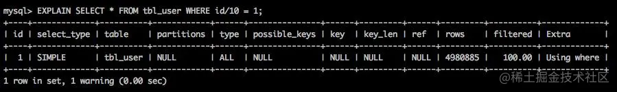 id是主键,id/10使用了算数表达式不走索引