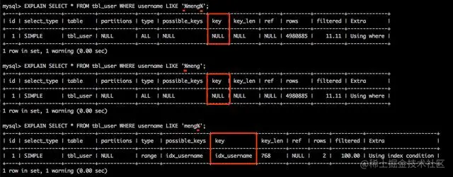 3. 模糊查询只有左前缀使用索引