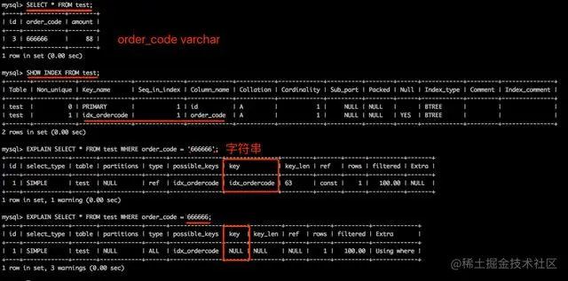 如果索引字段是字符串类型,那么查询条件的值必须使用引号,否则不走索引