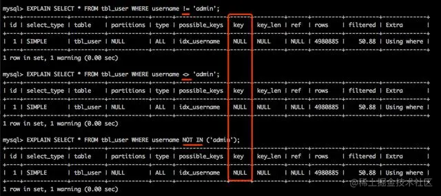 4. 反向条件不走索引 != 、 <> 、 NOT IN、IS NOT NULL