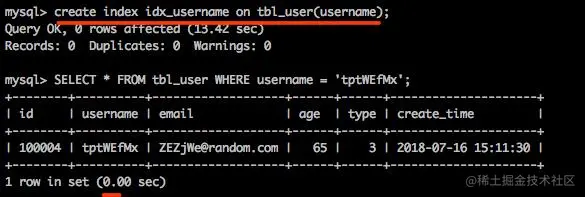 创建索引,然后再查询可以看到耗时0.00秒,这就是索引的威力