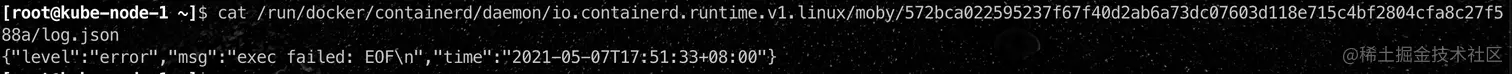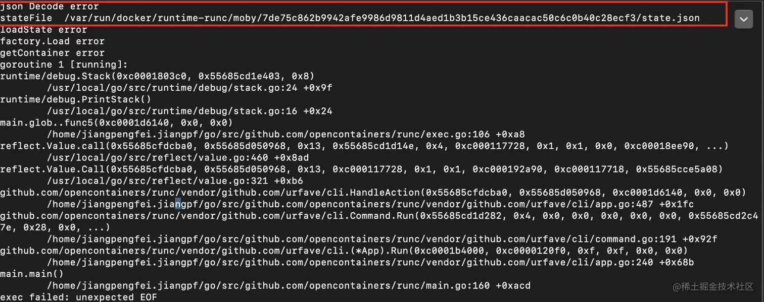 根据上面 docker 的日志,err 的错误信息为:OCI runtime exec failed: exec failed: EOF: unknown。也就是说 ContainerExecStart 返回了错误。
