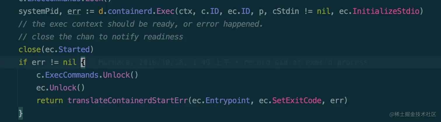 ContainerExecStart 会调用到 containerd.Exec,也就是 dockerd 和 containerd 之间进行通信