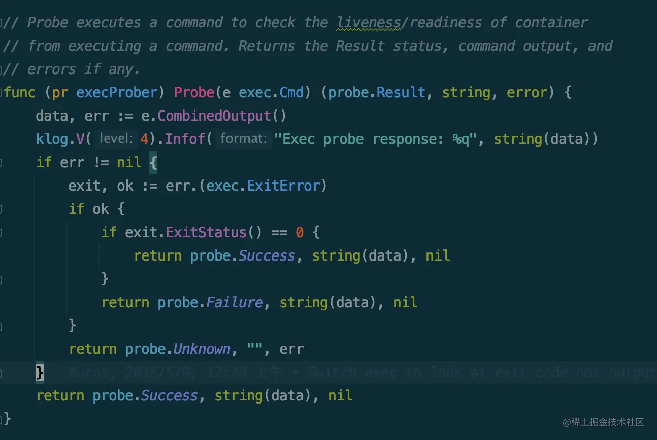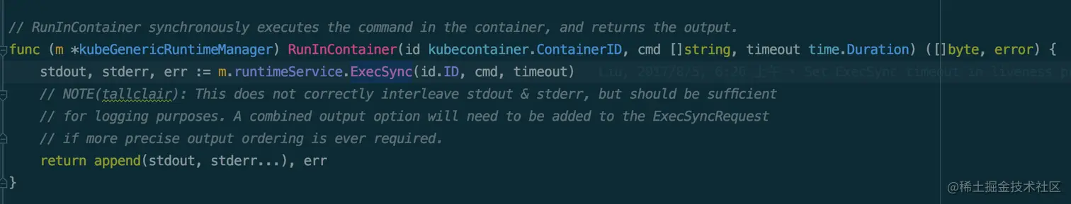 3、因为日志中显示 probe 类型为 Failure,因此 e.CombinedOutPut() 的 err != nil,并且 ExitStatus 不为 0,data 的值为 OCI runtime exec failed: exec failed: unexpected EOF: unknown,最终会调用到 RunInContainer 方法