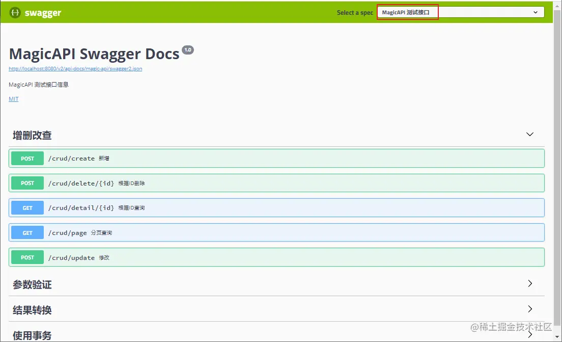 magic-api中写的接口了,访问地址:http://localhost:8080/swagger-ui.html