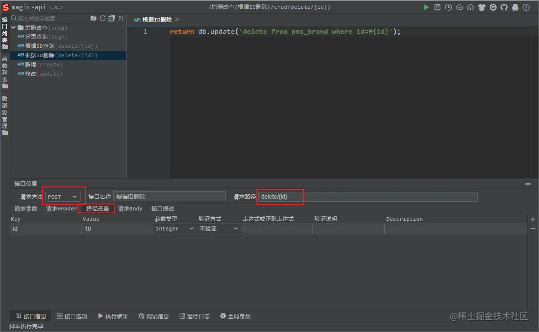 接口信息中进行如下配置,POST请求,请求路径为/delete/{id},请求参数放在路径变量中;